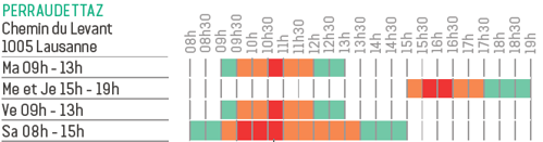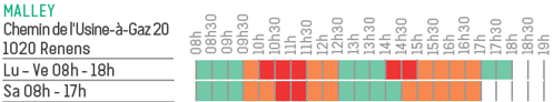 Légende : vert affluence réduite, orange affluence moyenne, rouge forte affluence